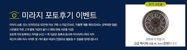 미라지 매장 또는 자사몰에서 50만원 이상 구매 시 사은품(원형 벽시계)을 드립니다. [ * 매월 베스트 포토리뷰 10명은 고급 램프 증정 ]