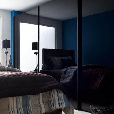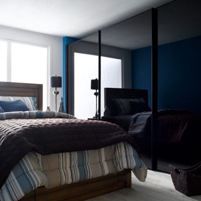 블랙 미러 붙박이장과 모던 컨츄리 침대로 꾸며진 침실이 모던하고 고급스러워 굉장히 멋집니다~